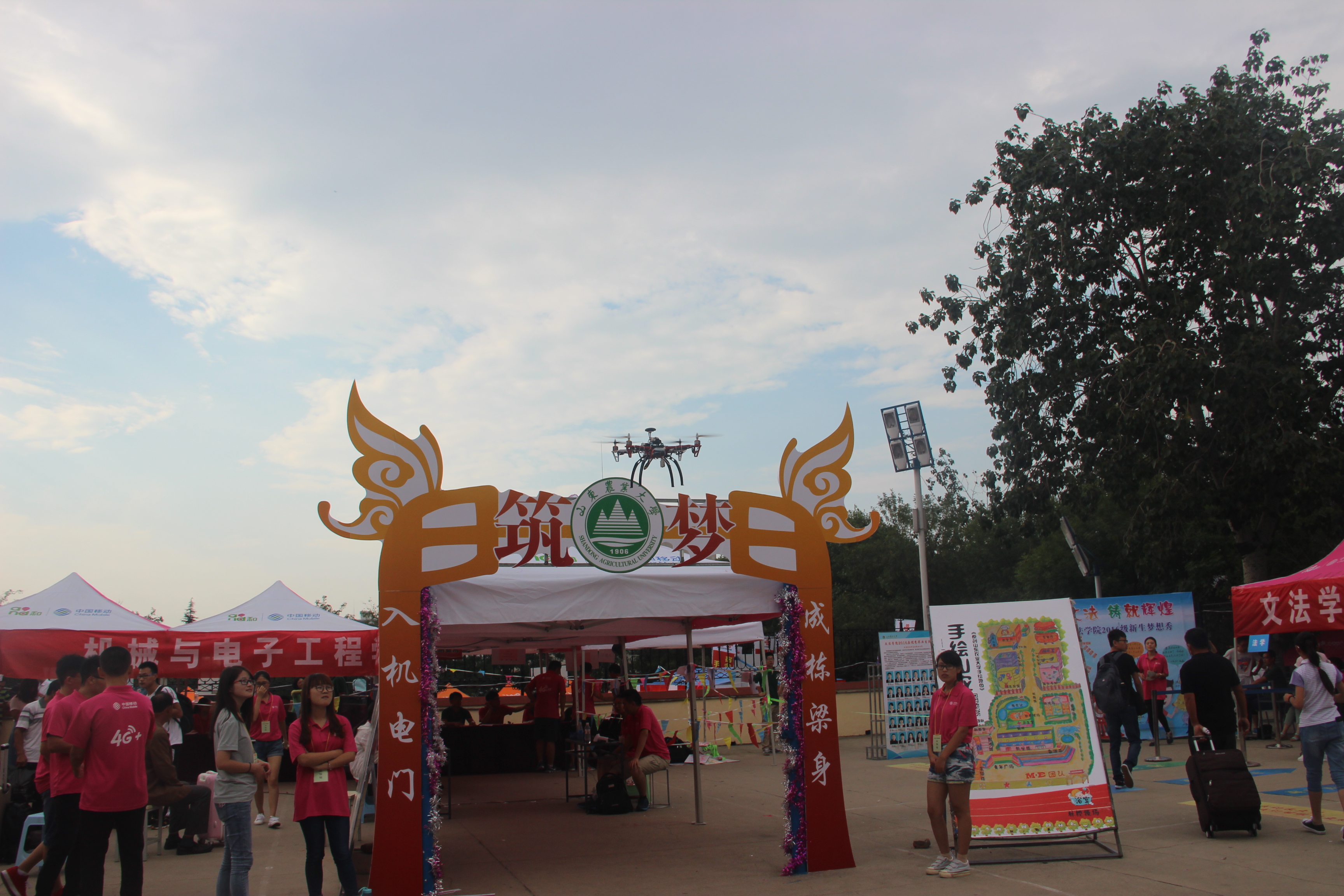 学生自己制作的四旋翼飞过学院迎新点上空,点燃新生好奇心