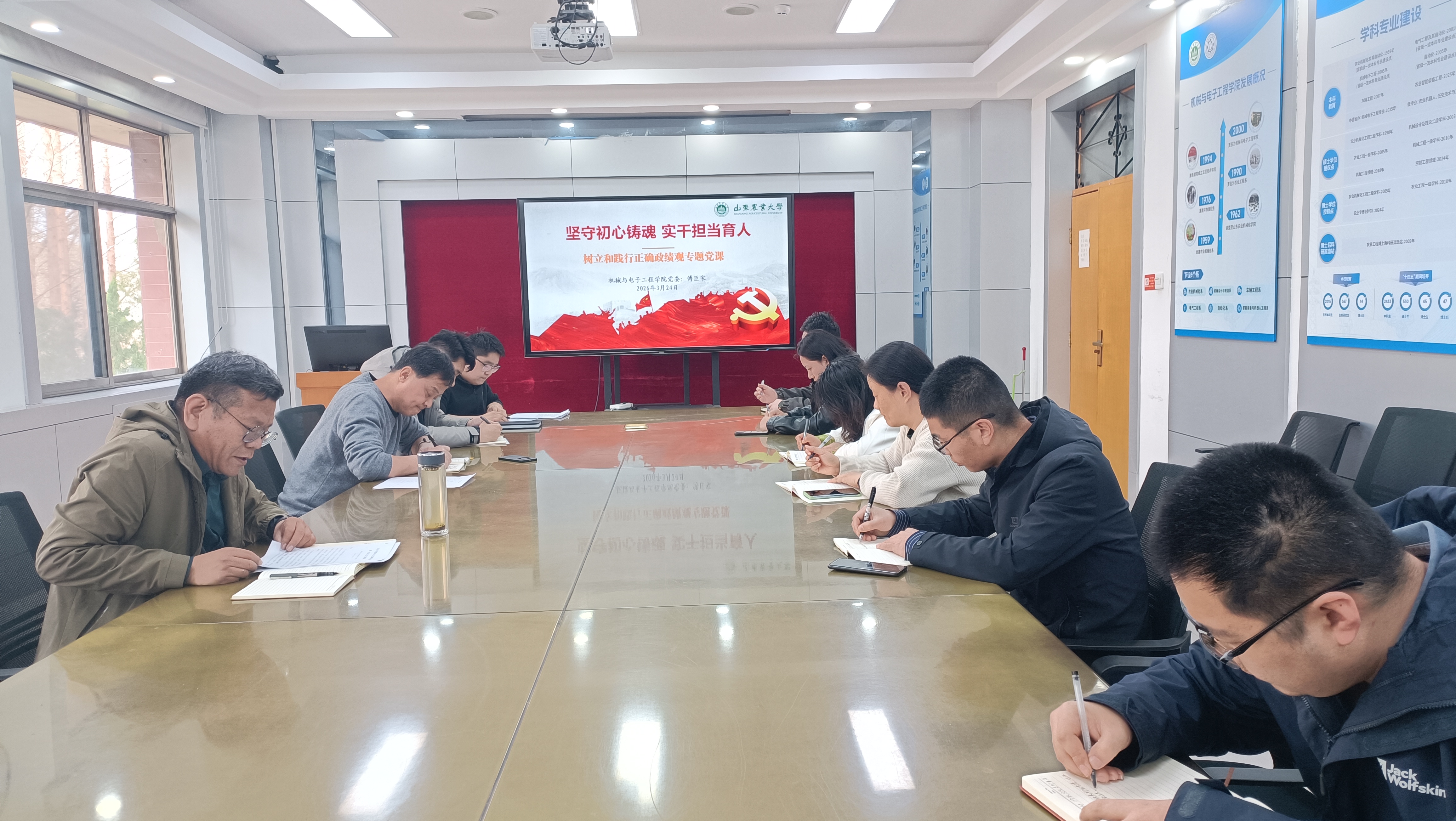 为深入贯彻落实党的二十届四中全会精神,持之以恒推进全面从严治党,3月24日,机电学院开展树立和践行正确政绩观专题党课,学院党委书记傅臣家授课,刘林老师主持党课,行政与实验中心党支部全体党员参加党课学习。